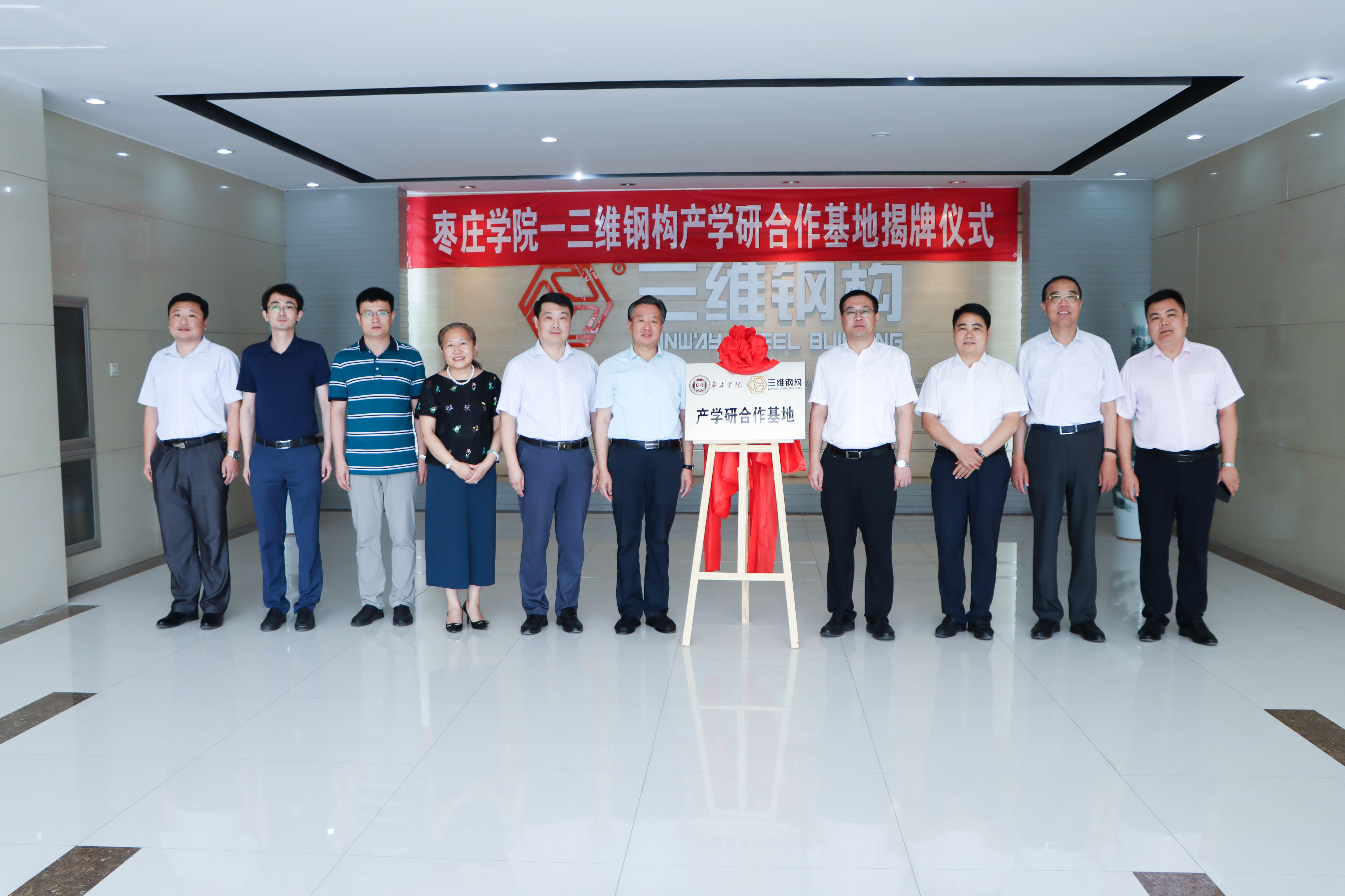 棗莊市人大常委會監察和司法工作室副主任王濤同志、滕州市副市長樊猛同志以及校企雙方代表共同為“山東三維鋼構與棗莊學院產學研合作基地”揭牌。